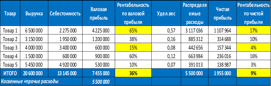 · по Товару 1 валовая рентабельность 65%, а по чистой прибыли уже всего 17%.